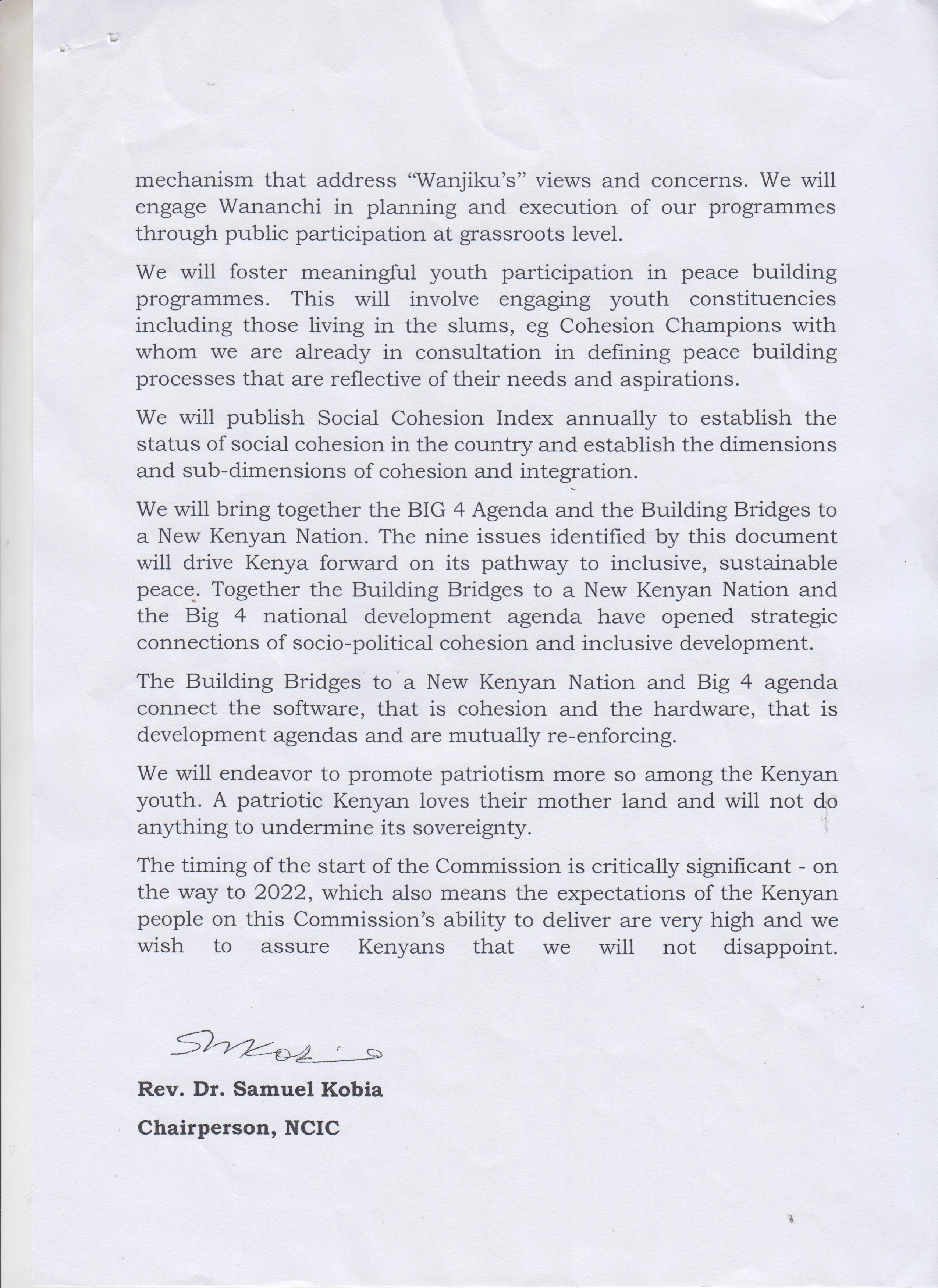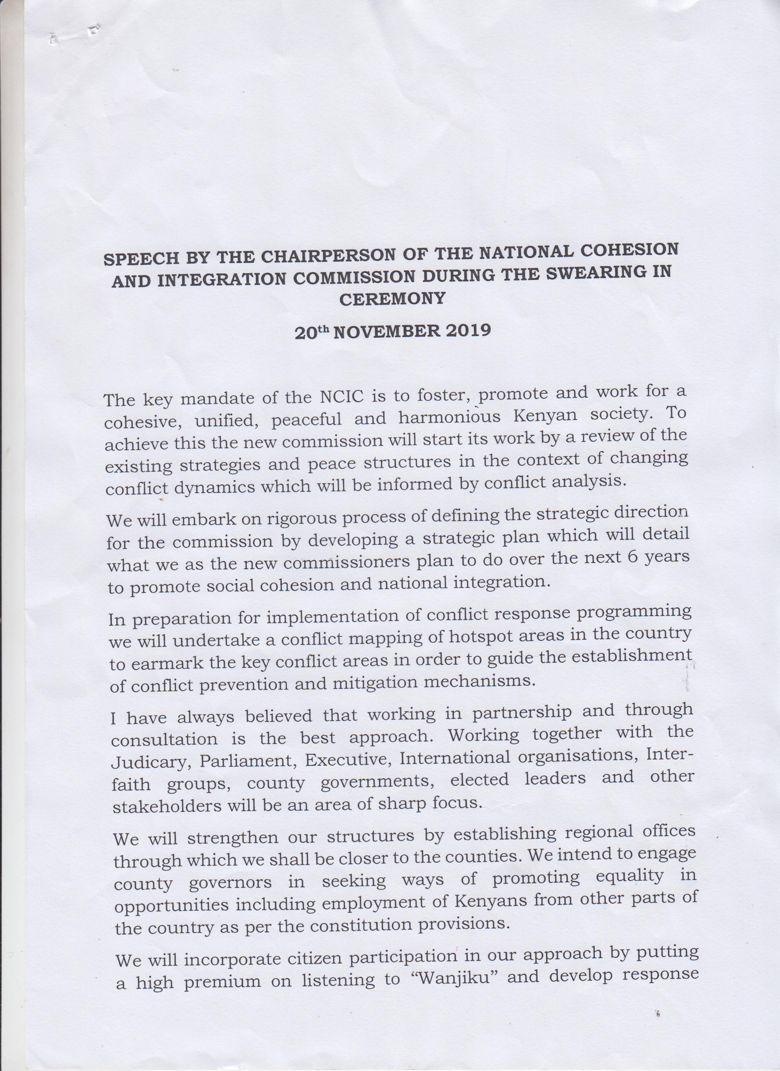 The National Cohesion and Integration Commission (NCIC) is a statutory body established under the National Cohesion and Integration Act No.12 of 2008.The establishment of NCIC recognized the need for national institution to promote national identity and values, mitigate ethno-political competition and ethnically motivatedviolence, eliminate discrimination on ethnic, racial and religious basis and promote national reconciliation and healing.